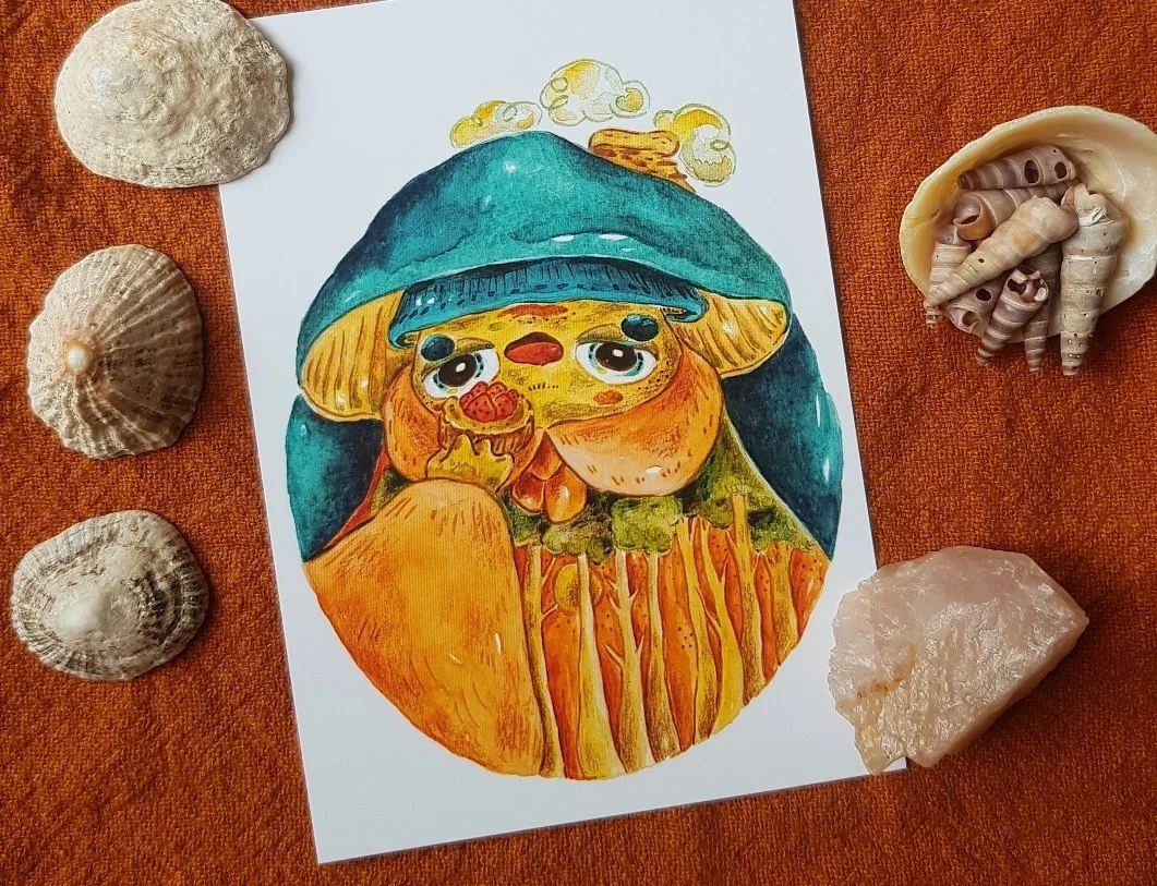 Illustration d'un magnifique spécimen de champitrognon en train de savourer une petite tarte aux fraises de plougastel.