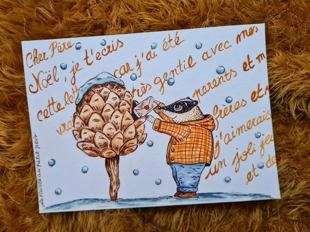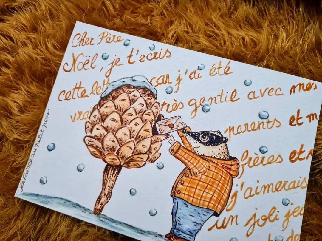 Image 1 sur 2 Image 2 sur 2 Aquarelle originale - la lettre au père noël 26,00 € Petite aquarelle originale du blaireau et sa lettre au père noëlA5Original signé Ajouter au panier Ajout effectué ! Petite aquarelle originale du blaireau et sa lettre au père noëlA5Original signé