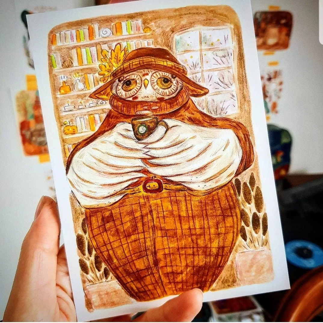 Carte de Noël A6 illustrée d’un hibou cosy.
